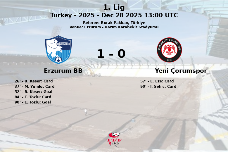 O Erzurum BB, com 43% de posse de bola, conseguiu capitalizar suas oportunidades de ataque, realizando 8 remates, dos quais 3 foram à baliza. O primeiro tempo foi marcado por cartões amarelos para B. Keser e M. Yumlu do Erzurum BB. Aos 52 minutos, B. Keser redimiu-se ao marcar o golo inaugural. O Yeni Çorumspor, com 57% de posse de bola, procurou o empate e gerou 7 remates, também com 3 à baliza. A partida permaneceu tensa, com um cartão amarelo mostrado a E. Eze do Yeni Çorumspor. Nos descontos, o Erzurum BB falhou um pênalti através de E. Tozlu, mas este recuperou a bola e marcou. A partida culminou com um cartão amarelo para I. Sehic do Yeni Çorumspor. Apesar da ligeira vantagem do Yeni Çorumspor na posse de bola e do mesmo número de remates à baliza, o Erzurum BB aproveitou as suas chances e garantiu a vitória em casa.
