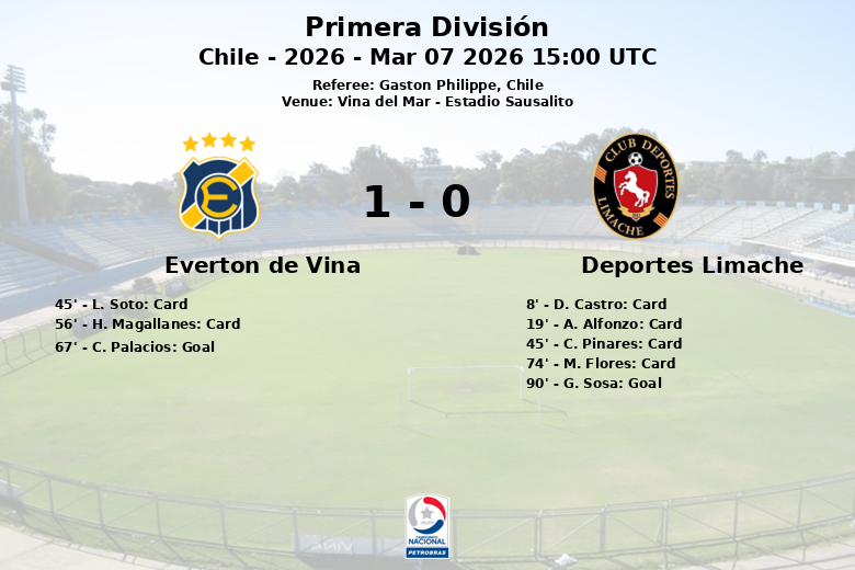 O único gol da partida saiu aos 67 minutos, quando C. Palacios do Everton, assistido por E. M. Ramos Aviles, conseguiu vencer o goleiro adversário. Quando parecia que o jogo terminaria com uma diferença mínima, o Deportes Limache teve a oportunidade de empatar no último minuto graças a um pênalti. No entanto, G. Sosa perdeu a cobrança, desperdiçando a chance de somar um ponto valioso.
