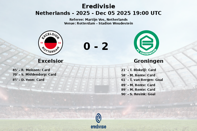 Nos minutos finais da partida, a tensão aumentou ainda mais. D. Yoon do Excelsior recebeu um cartão amarelo aos 85 minutos. O Groningen também sofreu uma expulsão aos 89 minutos, quando M. Rente recebeu seu segundo cartão amarelo, seguido de um vermelho. Aos 90 minutos, S. Resink do Groningen selou a vitória ao converter um pênalti, estabelecendo o placar final de 2 a 0.
