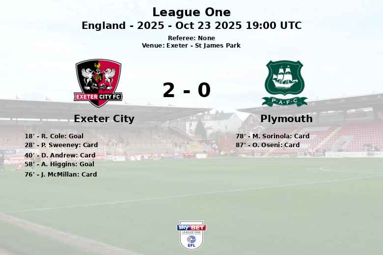 R. Cole abriu o placar para o Exeter aos 18 minutos, desencadeando euforia nas arquibancadas. Embora o Plymouth tenha tentado reagir, a defesa do Exeter permaneceu sólida. A partida foi caracterizada pela intensidade no meio-campo, refletida nas numerosas faltas cometidas por ambas as equipes: 20 para o Exeter e 12 para o Plymouth, levando a um total de 5 cartões amarelos distribuídos (3 para o Exeter e 2 para o Plymouth). A. Higgins ampliou a vantagem do Exeter aos 58 minutos com um gol que solidificou a vitória em casa. O Plymouth, com apenas um chute a gol em sete tentativas, não conseguiu converter suas oportunidades, enquanto o Exeter aproveitou melhor seus 13 chutes, 5 dos quais foram dirigidos ao gol. O Exeter adiciona três pontos valiosos à sua jornada na League One.