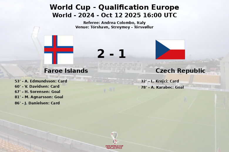 A partida permaneceu sem gols até o minuto 67, quando H. Sorensen, assistido por J. Andreasen, abriu o placar para os donos da casa. A República Tcheca respondeu no minuto 78 com um gol de A. Karabec, assistido por T. Chory, igualando o marcador. Quando parecia que o empate era inevitável, M. Agnarsson marcou no minuto 81, restaurando a vantagem das Ilhas Faroé. Apesar do esforço tcheco, o placar final terminou em um empate que reflete a competitividade do encontro.