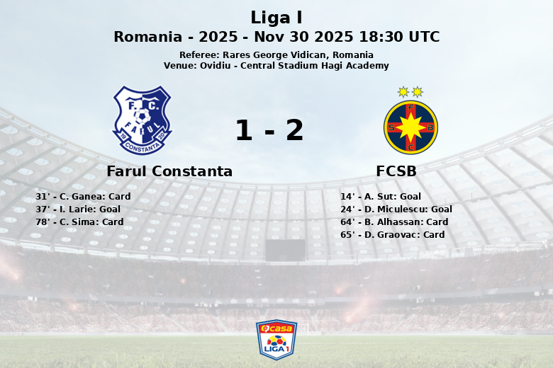 Um jogo vibrante aconteceu no Central Stadium Hagi Academy em Ovidiu, onde Farul Constanta e FCSB empataram em uma partida correspondente à 18ª jornada da Liga I romena. O FCSB assumiu a liderança com gols de A. Sut aos 14 minutos, com assistência de D. Olaru, e D. Miculescu aos 24 minutos. O Farul Constanta respondeu aos 37 minutos com um gol de pênalti convertido por I. Larie.