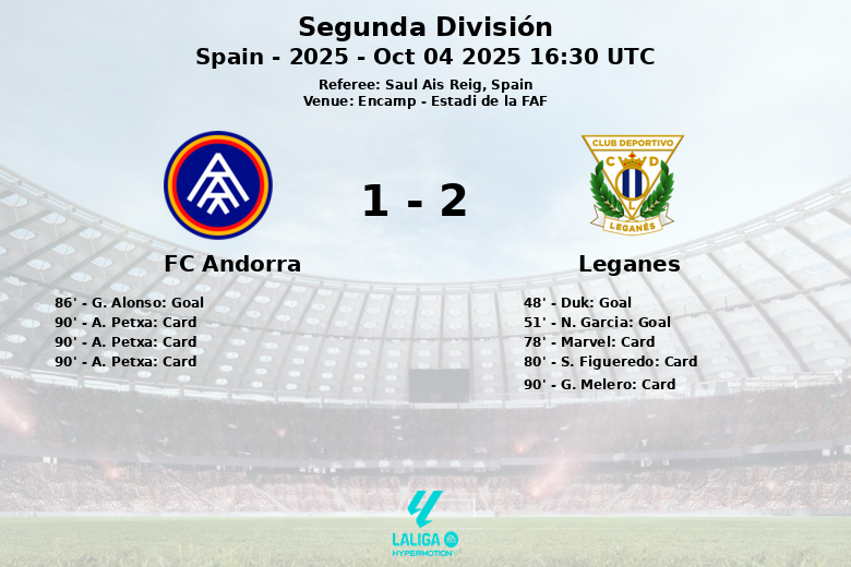 O jogo pendeu para o lado do Leganés no início do segundo tempo, com dois gols rápidos. Duk abriu o placar aos 48 minutos, seguido por um gol de N. Garcia aos 51 minutos. O Andorra, apesar de sua maior posse de bola e de criar mais chutes, encontrou a defesa do Leganés bem organizada. O esforço da equipe da casa foi recompensado com um gol de G. Alonso aos 86 minutos, assistido por S. Molina, mas não foi suficiente para reverter o resultado. A partida também foi marcada por vários cartões, culminando com a expulsão de A. Petxa nos acréscimos. O Leganés mostrou-se mais decisivo no terço final, aproveitando suas oportunidades e levando para casa três pontos valiosos.