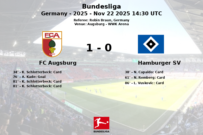 O único gol da partida surgiu aos 76 minutos, obra de A. Kade, assistido por D. Giannoulis, desencadeando a euforia na torcida local. Embora o Hamburger SV tenha tentado reagir, seus esforços foram em vão, e o Augsburg soube defender sua vantagem apesar de jogar com um homem a menos nos minutos finais. Os chutes a gol foram iguais (6 para cada equipe), mas a eficácia do Augsburg foi crucial para levar os três pontos. O encontro, correspondente à 11ª rodada da Bundesliga, deixou um sabor agridoce para o Hamburger SV, que deverá melhorar sua pontaria para os próximos compromissos.