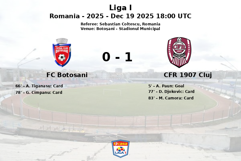 Logo aos 5 minutos, A. Paun do CFR 1907 Cluj, assistido por K. Muhar, marcou o único gol da partida, um resultado que acabou definindo o jogo. O FC Botosani tentou reverter a situação, lançando 14 chutes, dos quais apenas 2 foram ao gol, mostrando uma falta de precisão no ataque.