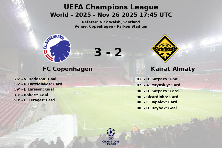 Copenhague, 26 de novembro de 2025 – O FC Copenhague garantiu uma valiosa vitória em casa no Parken Stadium contra o Kairat Almaty em uma partida disputada válida pela fase de grupos da UEFA Champions League. A partida, arbitrada pelo escocês Nick Walsh, foi uma montanha-russa de emoções, com um placar final que reflete a intensidade vivida em campo.