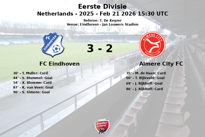 O primeiro tempo viu o FC Eindhoven assumir a liderança pouco antes do intervalo graças a um gol de S. Blummel aos 44 minutos, assistido por T. Simons. No entanto, o Almere City FC respondeu fortemente no segundo tempo. T. Bijleveld empatou aos 60 minutos, assistido por E. Cornelisse, e J. Rijkhoff colocou a equipe visitante na frente aos 69 minutos.