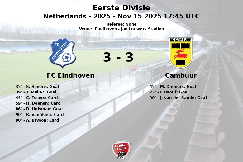 O jogo permaneceu empatado até os minutos finais. Aos 86 minutos, D. Huisman colocou o FC Eindhoven à frente novamente, graças a um passe de E. Lukoki Mateso. Mas a alegria local durou pouco, pois J. van der Sande selou a vitória para o Cambuur aos 90 minutos, assistido por O. Sjostrand. O Cambuur dominou a posse de bola com 70%, enquanto o FC Eindhoven recuou e buscou o contra-ataque. O jogo terminou com o placar de FC Eindhoven 3, Cambuur 4.