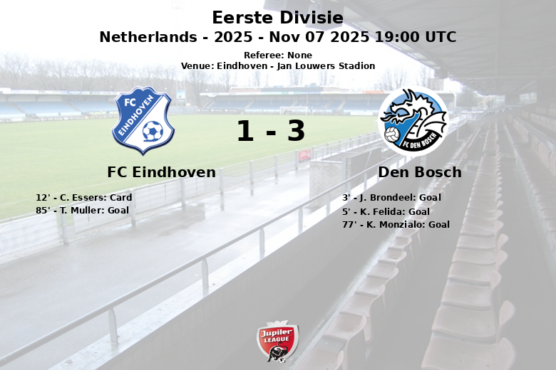 Eindhoven, Países Baixos – O Den Bosch garantiu uma importante vitória fora de casa contra o FC Eindhoven em uma partida realizada no Jan Louwers Stadion, correspondente à 15ª rodada da Eerste Divisie. O jogo, disputado em 7 de novembro de 2025, ofereceu momentos emocionantes e uma intensa batalha pelo controle da bola.