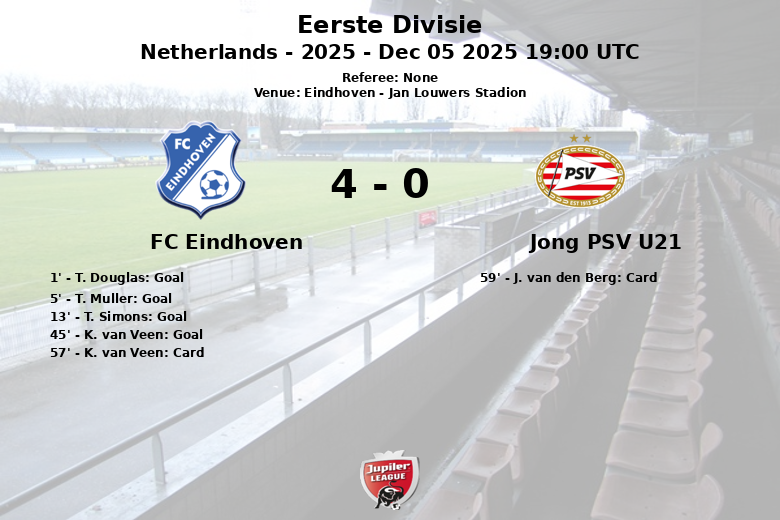 O FC Eindhoven apresentou uma exibição ofensiva dominante no Jan Louwers Stadion, superando o Jong PSV U21 com uma vitória retumbante. Desde o apito inicial, a equipe da casa impôs seu ritmo, abrindo o placar no primeiro minuto graças a T. Douglas, assistido por T. Simons. Apenas quatro minutos depois, T. Muller ampliou a vantagem. A pressão constante do FC Eindhoven continuou, e T. Simons marcou o terceiro aos 13 minutos, desta vez assistido por C. Essers. Antes do intervalo, K. van Veen acrescentou mais um gol, deixando o placar muito difícil para o Jong PSV U21 superar.