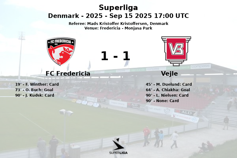 Fredericia, Dinamarca – Num jogo vibrante realizado no Monjasa Park, o FC Fredericia e o Vejle BK empataram em um gol cada, em uma partida correspondente à oitava rodada da Superliga Dinamarquesa. A equipe da casa dominou a posse de bola com 54%, gerando 13 remates, dos quais 5 foram direcionados ao gol. No entanto, foi o Vejle quem abriu o placar aos 64 minutos, graças a um gol de A. Chiakha, assistido por T. Gundelund. O FC Fredericia não se intimidou e alcançou a igualdade aos 73 minutos com um gol de O. Buch, após um passe de P. Egelund.