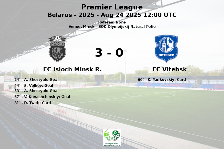Minsk, Bielorrússia – O FC Isloch Minsk R. apresentou uma atuação dominante diante de sua torcida no SOK Olympijskij Natural Polie, superando o FC Vitebsk em partida válida pela 19ª rodada da Premier League bielorrussa. O jogo, disputado em 24 de agosto de 2025, viu o Isloch assumir o controle desde o início.