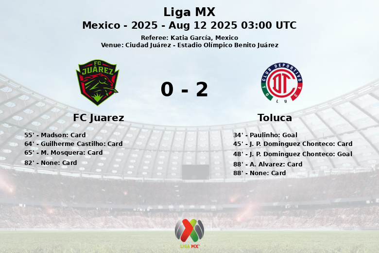 Ciudad Juárez foi o palco de um encontro disputado na Liga MX onde o Toluca levou a vitória. Apesar do FC Juárez ter dominado a posse de bola com 59%, o Toluca soube aproveitar as suas oportunidades e concretizar gols. Paulinho abriu o placar para o Toluca aos 34 minutos, com assistência de R. Morales, mostrando a efetividade da equipe visitante no primeiro tempo.