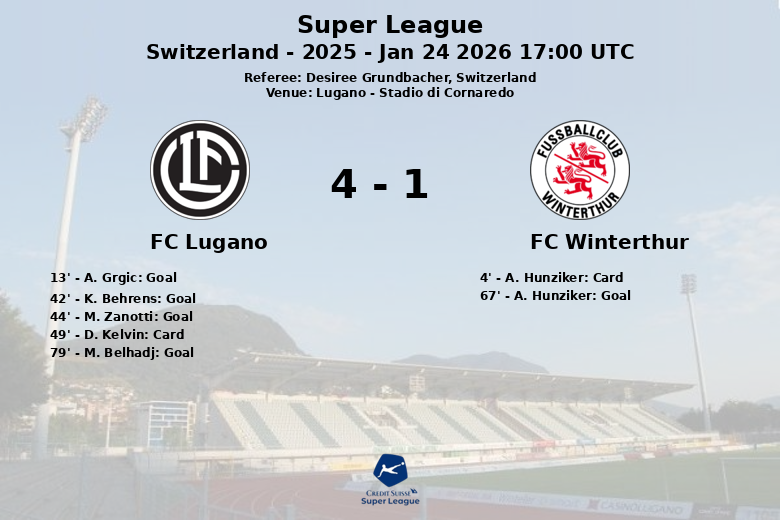 Apesar de um cartão amarelo precoce para A. Hunziker do Winterthur aos 4 minutos, foi o Lugano quem abriu o placar aos 13 minutos graças a um gol de A. Grgic. O domínio continuou, e antes do intervalo, K. Behrens (42′) e M. Zanotti (44′) ampliaram a vantagem, praticamente selando a partida.