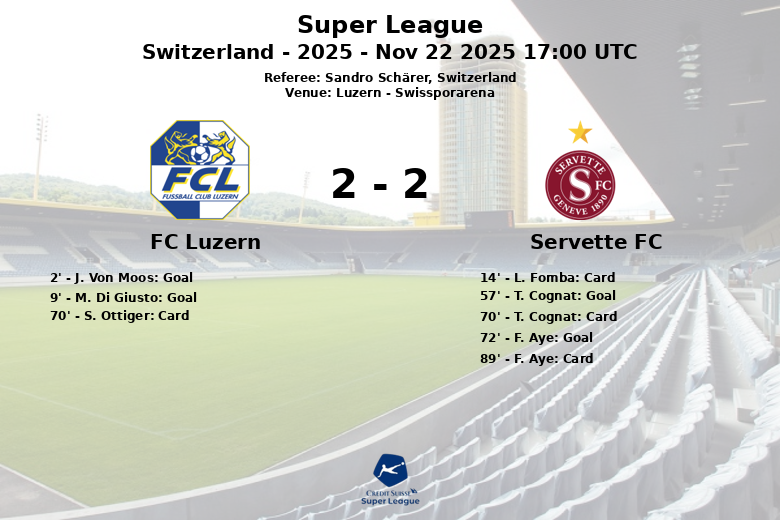 Lucerna, Suíça – Em uma partida vibrante e com muitas alternativas, o FC Luzern e o Servette FC empataram em um confronto disputado na Swissporarena. A partida, correspondente à 14ª rodada da Super Liga Suíça, Temporada 2025, terminou com um placar final de 2-2.