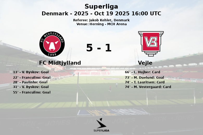 Herning, Dinamarca – Em uma partida disputada no MCH Arena, o FC Midtjylland demonstrou sua superioridade ao vencer de forma convincente o Vejle com uma atuação dominante. O encontro, correspondente à 12ª jornada da Superliga dinamarquesa, deixou claro o domínio da equipe local desde os primeiros minutos.