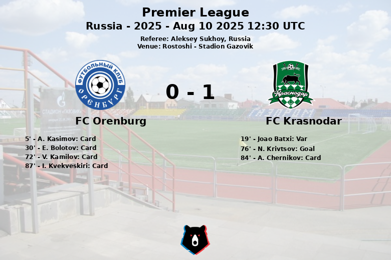 Rostoshi, Rússia – Em um jogo disputado no Stadion Gazovik, o FC Krasnodar garantiu uma vitória apertada de 1 a 0 contra o FC Orenburg, na quarta rodada da Premier League Russa. A partida, apitada por Aleksey Sukhoy, foi marcada por intensidade e batalhas no meio-campo.