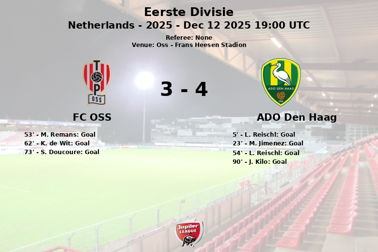 O FC Oss respondeu no segundo tempo, com M. Remans marcando aos 53 minutos graças a uma assistência de S. Doucoure. A alegria local durou pouco, já que L. Reischl marcou novamente para o ADO Den Haag apenas um minuto depois, desta vez assistido por S. Sylla.