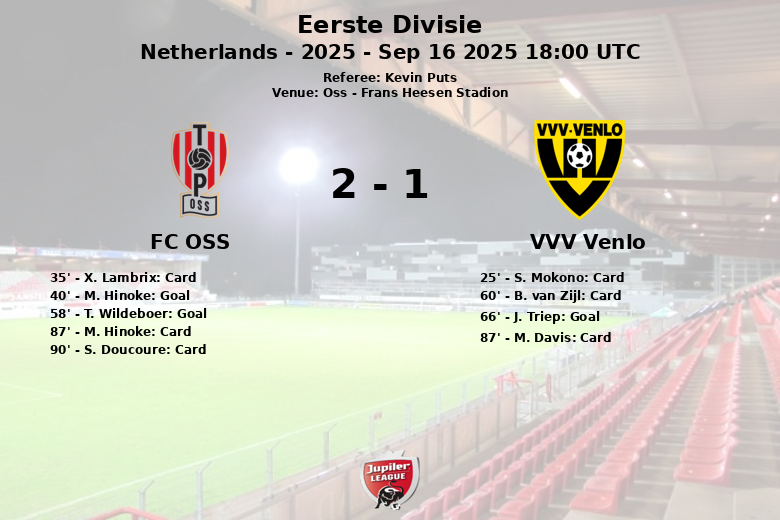 Substituiões na equipe de fc oss: Aos 61 minutos, L. Slagveer entrou e J. Zimmerman saiu., Aos 71 minutos, T. Wildeboer entrou e S. Doucoure saiu., Aos 71 minutos, M. Remans entrou e M. Esajas saiu., Aos 71 minutos, B. Van Hove entrou e J. Kuijpers saiu., Aos 85 minutos, L. Mol entrou e K. de Wit saiu.