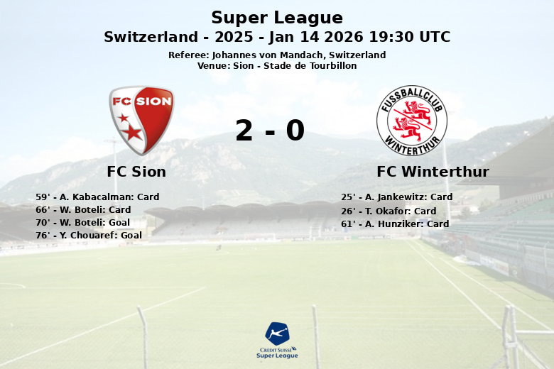 Foi no segundo tempo que o Sion materializou seu domínio no placar. W. Boteli abriu o placar aos 70 minutos, graças a uma assistência de Y. Chouaref. Pouco depois, aos 76 minutos, o próprio Y. Chouaref ampliou a vantagem, selando a vitória para a equipe da casa.