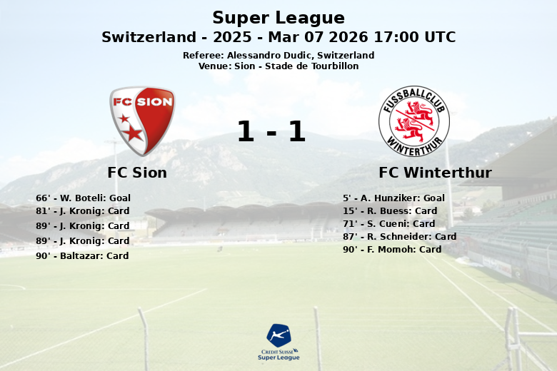 Sion, Suíça – Em um encontro disputado no Stade de Tourbillon, FC Sion e FC Winterthur empataram em um jogo carregado de intensidade e emoção. Winterthur surpreendeu no início, com A. Hunziker marcando aos 5 minutos com assistência de N. Burkart. No entanto, a posse de bola favoreceu claramente o Sion, que dominou o jogo com 68% da posse. Apesar de gerar inúmeras oportunidades, com um total de 23 chutes, apenas 7 foram ao gol. A defesa do Winterthur mostrou-se sólida, embora tenha cometido um número maior de faltas (17 contra 16 do Sion) e acumulado 3 cartões amarelos. O Sion empatou a partida aos 66 minutos graças a W. Boteli, assistido por B. Kololli. O final da partida foi caótico, com a expulsão de J. Kronig do Sion aos 89 minutos e vários cartões amarelos mostrados no tempo adicional. Apesar da posse de bola inferior e da pressão constante, o Winterthur conseguiu manter o empate, demonstrando solidez defensiva e aproveitando a sua oportunidade inicial. O árbitro Alessandro Dudic teve uma tarde ocupada, distribuindo cartões para ambas as equipes.