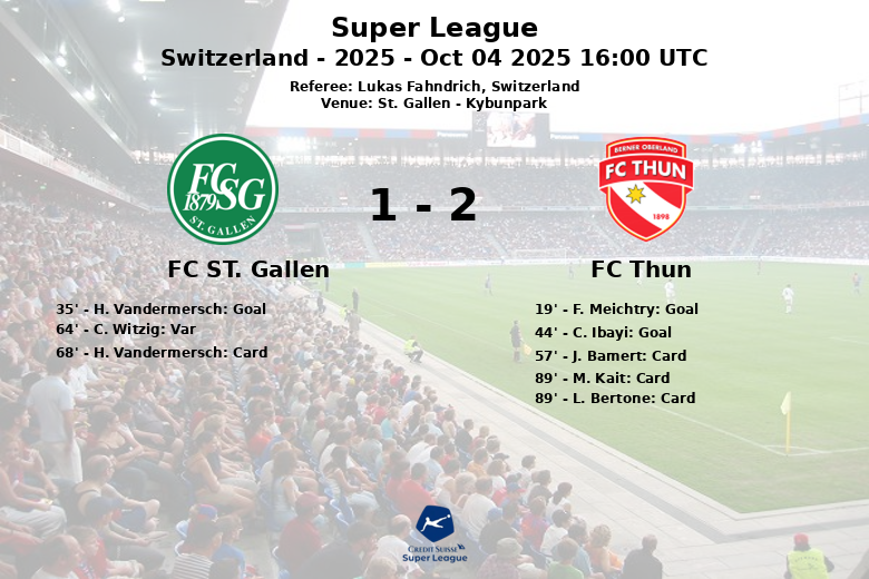 St. Gallen, Suíça – O Kybunpark testemunhou um confronto vibrante da Super League, onde o FC Thun prevaleceu sobre o FC St. Gallen em uma partida repleta de emoções. O Thun abriu o placar aos 19 minutos com um gol de F. Meichtry, assistido por V. Matoshi. O St. Gallen respondeu aos 35 minutos com um gol de H. Vandermersch, mas o Thun retomou a liderança pouco antes do intervalo, aos 44 minutos, com um gol de C. Ibayi.