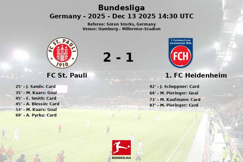 No segundo tempo, M. Kaars marcou novamente para o St. Pauli aos 53 minutos, ampliando a vantagem da equipe da casa. No entanto, o Heidenheim reagiu com um gol de M. Pieringer aos 64 minutos, assistido por S. Schimmer, reduzindo a diferença. Apesar dos esforços do St. Pauli, a superioridade numérica do Heidenheim e a maior posse de bola (63% em comparação com 37% do St. Pauli) acabaram pesando muito. A partida foi caracterizada por intensidade no meio-campo e numerosas faltas, com um total de 6 para o St. Pauli e 14 para o Heidenheim. Além do cartão vermelho, o St. Pauli recebeu 2 cartões amarelos adicionais, enquanto o Heidenheim recebeu 3. O St. Pauli teve 8 chutes no total (5 no alvo), enquanto o Heidenheim dominou nesse aspecto com 20 chutes (7 no alvo). Os escanteios também favoreceram o Heidenheim (10 contra 4 do St. Pauli). O árbitro Sören Storks teve uma tarde agitada nesta partida da Bundesliga.