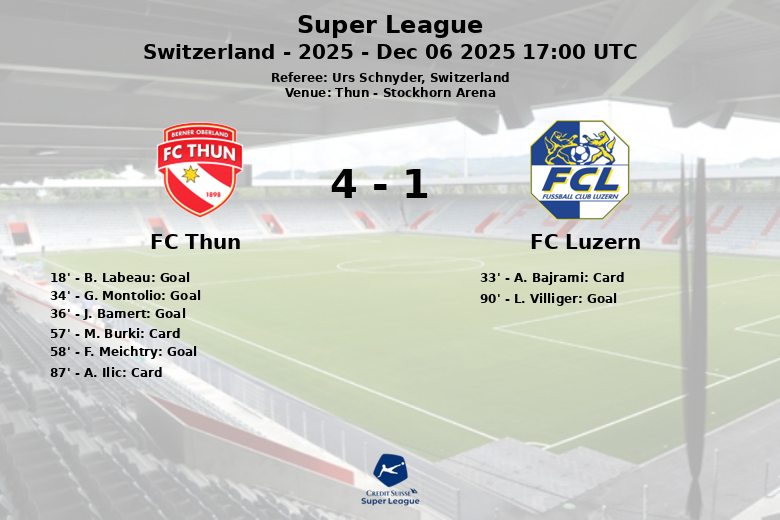 Thun, Suíça – Em uma partida realizada no Stockhorn Arena, o FC Thun demonstrou sua proeza ofensiva ao derrotar o FC Luzern com uma atuação dominante. Desde o início, o time da casa impôs seu ritmo, com um gol logo aos 18 minutos de B. Labeau, com assistência de C. Ibayi. Apesar das tentativas do FC Luzern de reagir, a defesa do Thun permaneceu sólida.