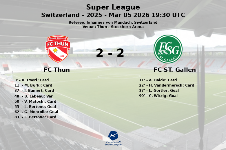Quando parecia que o FC Thun levaria a vitória, C. Witzig do FC St. Gallen marcou um gol aos 90 minutos, igualando o placar final. Apesar da maior porcentagem de posse de bola do FC Thun (51% contra 49%), o FC St. Gallen mostrou-se mais perigoso no ataque, com 14 chutes no total, embora apenas 3 tenham ido ao alvo. A partida foi marcada por um alto número de faltas (25 do FC Thun e 12 do FC St. Gallen) e cartões amarelos (5 para o FC Thun e 2 para o FC St. Gallen), demonstrando a intensidade e a luta constante em campo.