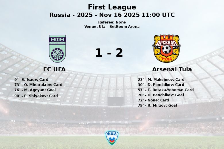 Ufa, Rússia – Em um confronto disputado na BetBoom Arena, o Arsenal Tula e o FC UFA empataram em um jogo cheio de intensidade e faltas marcadas. O duelo, correspondente à 19ª rodada da First League russa, temporada 2025, terminou em um empate que deixou ambas as equipes com a sensação de que poderiam ter obtido mais.