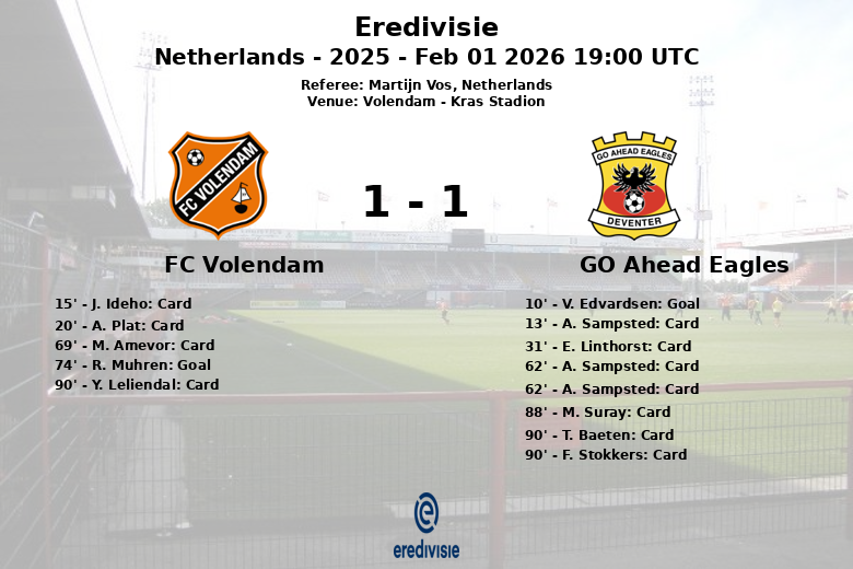 Volendam, Países Baixos – Num jogo carregado de emoções e cartões, o FC Volendam e o GO Ahead Eagles empataram no Kras Stadion. A equipe visitante abriu o placar logo aos 10 minutos, com um gol de V. Edvardsen. Apesar de ter menos posse de bola (38% contra 62% do Volendam) e receber numerosos cartões amarelos (cinco) e um vermelho para A. Sampsted aos 62 minutos, o GO Ahead Eagles conseguiu manter a vantagem durante grande parte do jogo. O FC Volendam, que dominou a posse de bola e gerou mais finalizações (20 contra 13 do GO Ahead Eagles), finalmente encontrou o empate aos 74 minutos, graças a R. Muhren, com assistência de R. van Cruijsen. O jogo foi disputado, com um total de 12 cartões mostrados, evidenciando a intensidade do encontro. No final, o empate deixa um sabor agridoce para ambas as equipes, especialmente para o Volendam, que jogou com um jogador a mais durante quase meia hora.