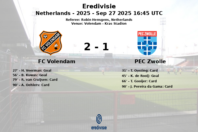 Volendam, Países Baixos – Em um jogo disputado no Kras Stadion, FC Volendam e PEC Zwolle empataram em uma partida cheia de intensidade e cartões. O FC Volendam abriu o placar aos 27 minutos com um gol de H. Veerman, assistido por J. Ideho. No entanto, o PEC Zwolle respondeu pouco antes do intervalo com um gol de K. de Rooij, assistido por K. Kostons, igualando o marcador.