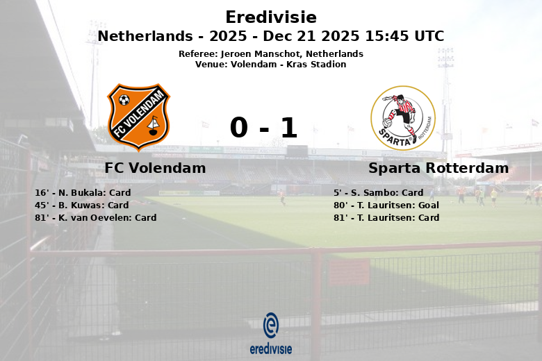 Volendam, Países Baixos – Uma partida tensa e repleta de cartões amarelos no Kras Stadion viu o Sparta Rotterdam garantir uma vitória magra sobre o FC Volendam. A partida, válida pela 17ª rodada da Eredivisie, foi marcada por um jogo físico e disputado, refletido nos cinco cartões amarelos mostrados ao FC Volendam e dois ao Sparta Rotterdam.