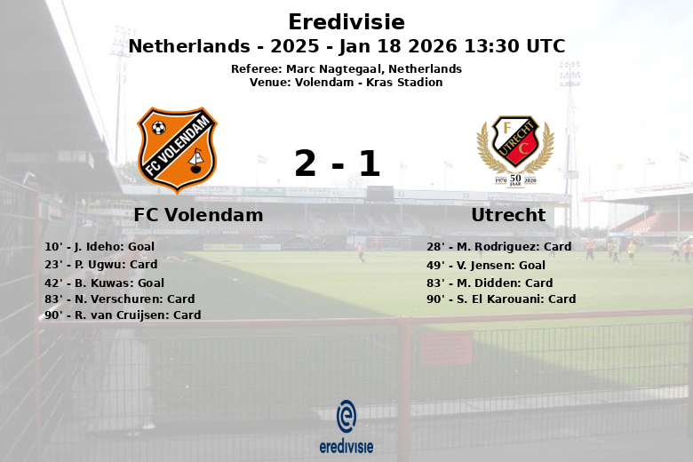 Volendam, Países Baixos – O FC Volendam triunfou sobre o Utrecht em um jogo vibrante e disputado no Kras Stadion. A partida, correspondente à 19ª rodada da Eredivisie, foi marcada pela intensidade e inúmeras advertências.