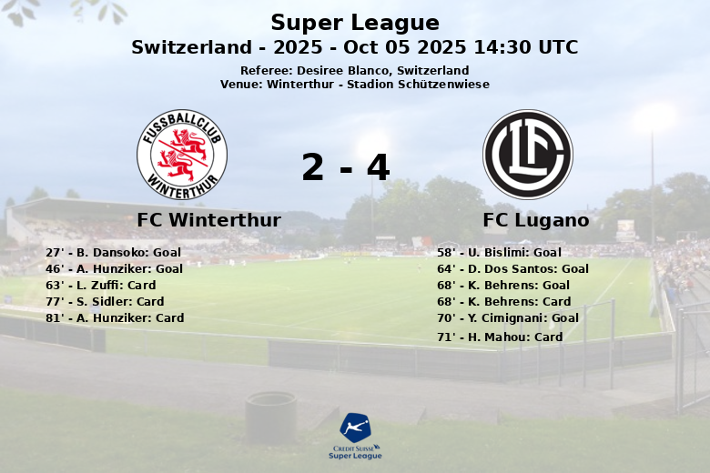 Winterthur, Suíça – Em uma partida realizada no Stadion Schützenwiese, o FC Lugano orquestrou uma virada espetacular contra o FC Winterthur na oitava rodada da Super League suíça. A partida, arbitrada por Desiree Blanco, viu o Winterthur assumir a liderança graças a um gol de B. Dansoko aos 27 minutos, com uma assistência não especificada. Logo após o início do segundo tempo, A. Hunziker ampliou a vantagem do Winterthur aos 46 minutos, assistido por E. Maluvunu.