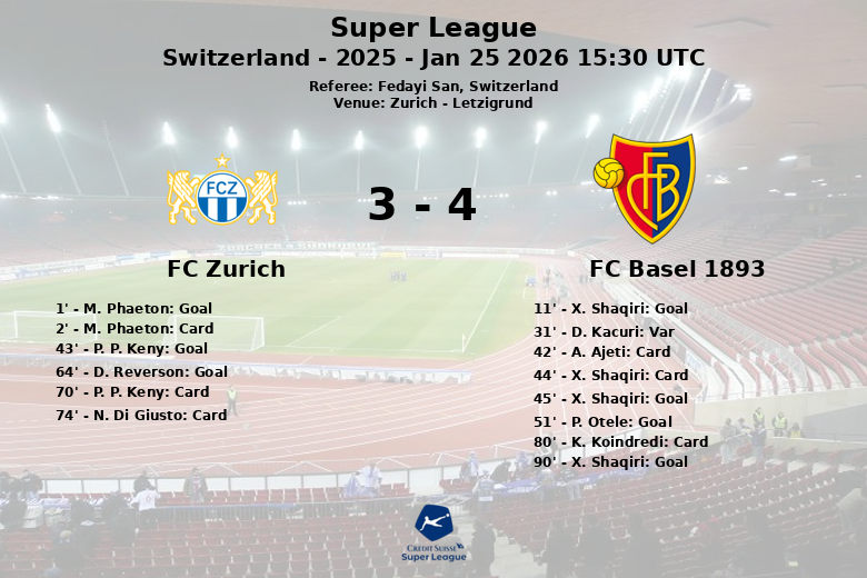 Zurique, Suíça – Em uma partida vibrante realizada no Letzigrund, o FC Basel 1893 derrotou o FC Zurich em um eletrizante encontro da Super League. A partida, arbitrada por Fedayi San, foi repleta de emoção desde o apito inicial até o final.