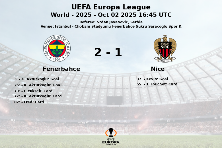 Istambul testemunhou um vibrante encontro da UEFA Europa League, onde o Fenerbahce derrotou o Nice por 2 a 1. A partida, disputada no Chobani Stadyumu Fenerbahçe Sükrü Saracoglu Spor K, foi apitada pelo árbitro sérvio Srdan Jovanovic.