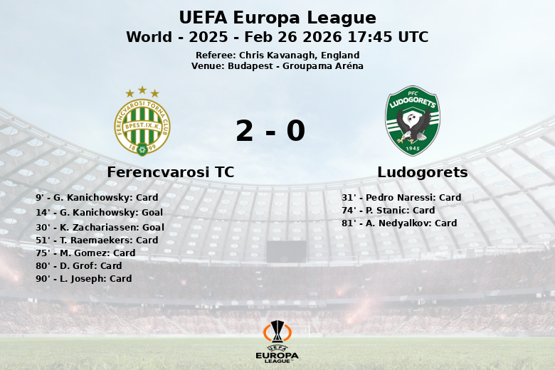 Budapeste testemunhou uma vitória convincente do Ferencvarosi TC sobre o Ludogorets na fase de 16 avos de final da Liga Europa da UEFA. A partida, realizada na Groupama Aréna, terminou com um resultado favorável à equipe da casa.