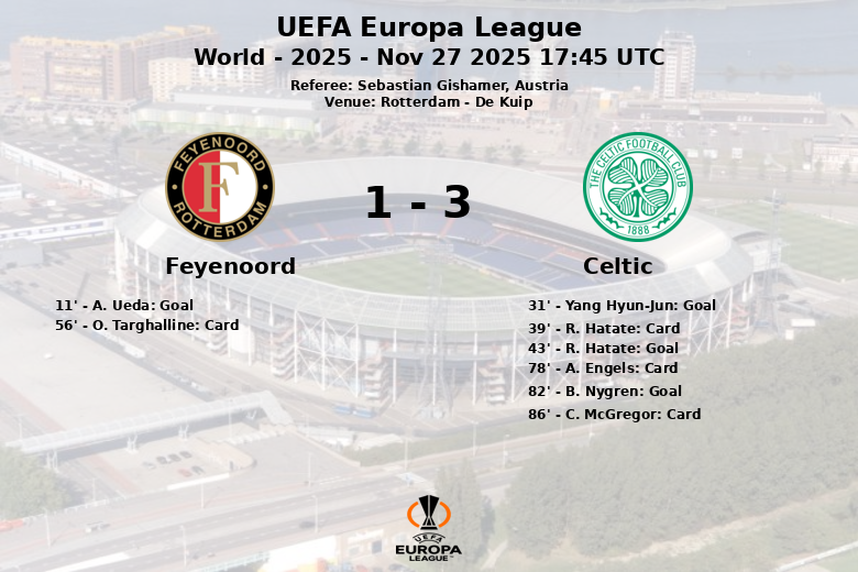 Rotterdam testemunhou uma partida vibrante onde o Celtic de Glasgow prevaleceu sobre o Feyenoord com um placar final de 3-1 em um confronto da UEFA Europa League. Apesar do Feyenoord ter aberto o placar logo aos 11 minutos com um gol de A. Ueda, assistido por S. Steijn, o Celtic respondeu com determinação. Yang Hyun-Jun empatou aos 31 minutos, assistido por R. Hatate, que mais tarde se tornou o protagonista ao marcar o segundo gol para os escoceses aos 43 minutos. A partida foi marcada por um jogo físico, evidenciado pelos cartões amarelos mostrados a R. Hatate (39′), O. Targhalline (56′), A. Engels (78′) e C. McGregor (86′). O Celtic garantiu a vitória com um gol de B. Nygren aos 82 minutos, assistido por D. Maeda. O Celtic dominou ligeiramente a posse de bola com 51%, enquanto o Feyenoord teve 49%. No entanto, o Celtic foi mais eficaz em frente ao gol, convertendo 4 de seus 6 chutes a gol, enquanto o Feyenoord só conseguiu 3 chutes a gol de 12 tentativas.