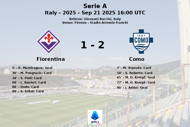 A Fiorentina abriu o placar logo cedo com um gol de R. Mandragora aos 6 minutos. No entanto, o Como reagiu no segundo tempo. Primeiro, M. O. Kempf empatou a partida aos 65 minutos, com assistência de N. Paz. Já nos acréscimos, J. Addai selou a vitória, também com assistência de N. Paz, garantindo uma importante vitória para o Como.
