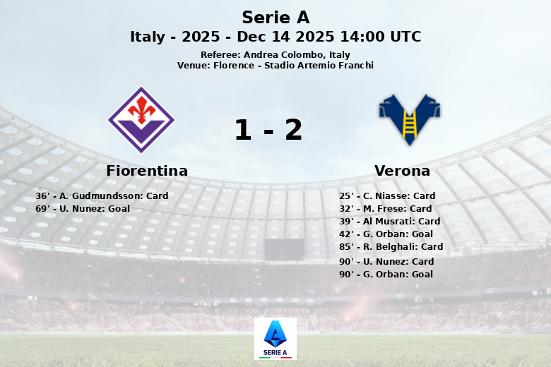 O Verona garantiu uma valiosa vitória por 2-1 contra a Fiorentina no Stadio Artemio Franchi, em um jogo da Serie A correspondente à 15ª rodada. Apesar do domínio da Fiorentina na posse de bola (66%), o Verona mostrou-se eficaz em seus ataques.