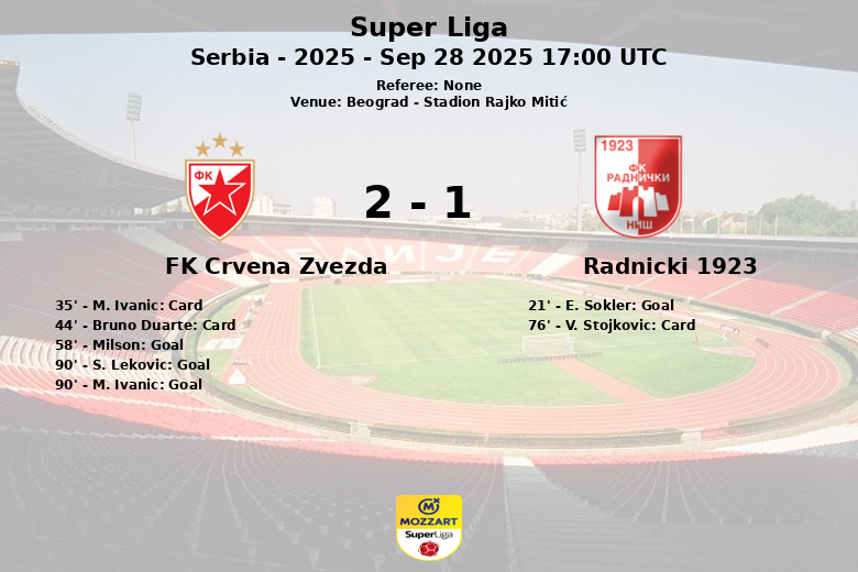 Belgrado, Sérvia – Em uma partida vibrante e cheia de emoções, o FK Crvena Zvezda conseguiu um empate de 2 a 2 em casa contra o Radnicki 1923 no Stadion Rajko Mitić. A partida, correspondente à décima rodada da Super Liga, Temporada 2025, deixou os torcedores à beira de seus assentos até o último minuto.