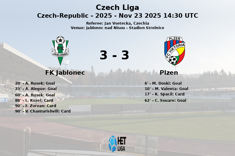 Jablonec nad Nisou testemunhou um encontro emocionante entre o FK Jablonec e o Plzen, que terminou em um empate de três gols. O Plzen começou dominando a partida, com gols logo no início de M. Doski aos 6 minutos, assistido por A. Memic, e M. Valenta aos 10 minutos, assistido por T. Ladra. K. Spacil do Plzen recebeu um cartão amarelo aos 17 minutos.