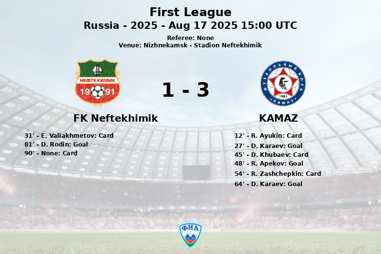 Nizhnekamsk, Rússia – O KAMAZ emergiu vitorioso contra o FK Neftekhimik em uma partida realizada no Stadion Neftekhimik como parte da quinta rodada da temporada regular da First League. O jogo, caracterizado por vários cartões amarelos, culminou em uma vitória convincente para o KAMAZ.