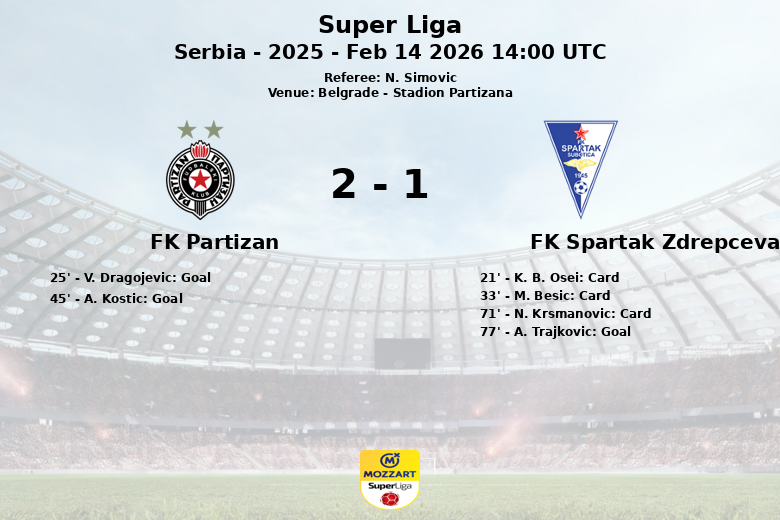 Belgrado foi palco de um jogo intenso entre o FK Partizan e o FK Spartak Zdrepceva KRV, onde o Partizan saiu vitorioso. O encontro, válido pela 23ª rodada da Super Liga, foi disputado no Stadion Partizana sob o olhar atento do árbitro N. Simovic.