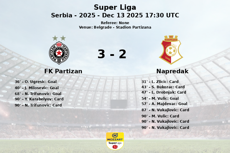 Belgrado, 13 de dezembro de 2025 – O Stadion Partizana foi palco de uma partida vibrante e disputada entre o FK Partizan e o Napredak, correspondente à 19ª rodada da Super Liga sérvia. O FK Partizan conquistou a vitória em um encontro caracterizado por sua intensidade e uma chuva de cartões.