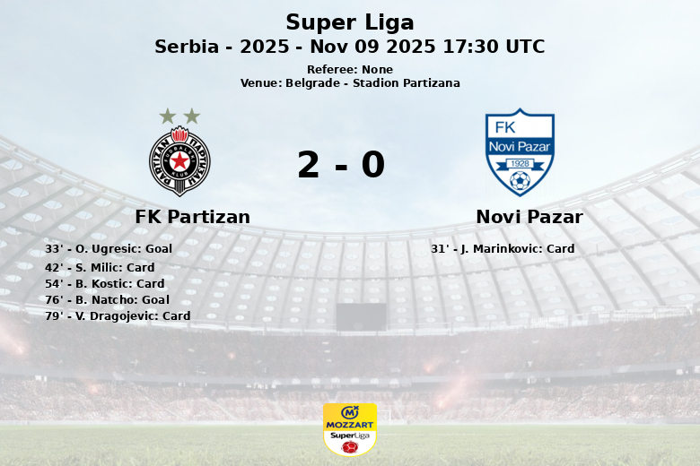 Belgrado, Sérbia – O FK Partizan garantiu uma vitória sobre o Novi Pazar em um jogo da Super Liga Sérvia realizado no Stadion Partizana. A partida, parte da 15ª rodada da temporada regular, foi marcada por intensidade e jogo físico, refletido nas numerosas faltas cometidas por ambas as equipes.