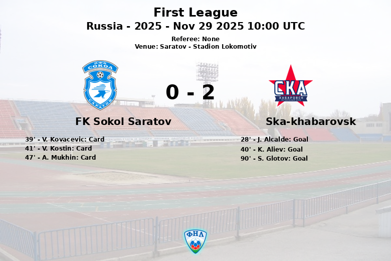 O SKA-Khabarovsk garantiu uma importante vitória fora de casa no Stadion Lokomotiv em Saratov, derrotando o FK Sokol Saratov em uma partida correspondente à 21ª rodada da First League russa. O encontro, disputado em um ambiente intenso, viu o SKA-Khabarovsk assumir a liderança aos 28 minutos, graças a um gol de J. Alcalde.
