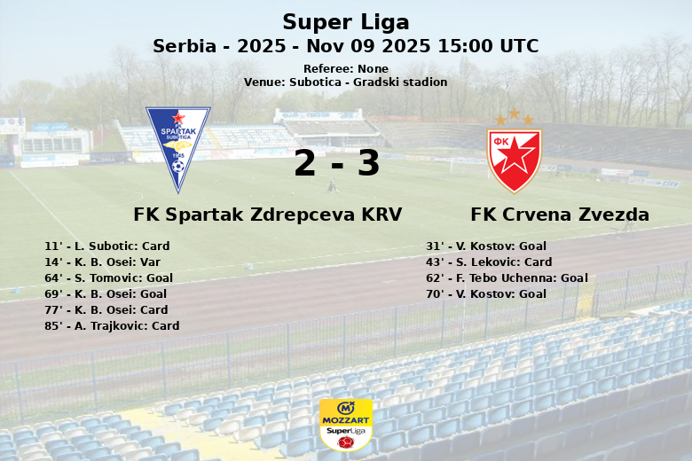 Subotica, Sérvia – Num jogo vibrante e cheio de alternativas, o Crvena Zvezda derrotou o FK Spartak Zdrepceva KRV no Gradski Stadion por um placar de 4 a 3. A partida, correspondente à 15ª jornada da Super Liga Sérvia, foi um verdadeiro espetáculo para os torcedores.