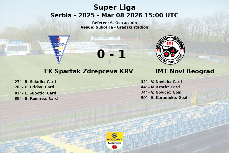 Num encontro disputado no Gradski stadion em Subotica, o IMT Novi Beograd conquistou uma vitória dramática por 2-0 sobre o FK Spartak Zdrepceva KRV. O IMT dominou claramente a posse de bola com 67% contra 33% do Spartak. No entanto, a solidez defensiva do Spartak e a sua disciplina tática complicaram as coisas para a equipe visitante.